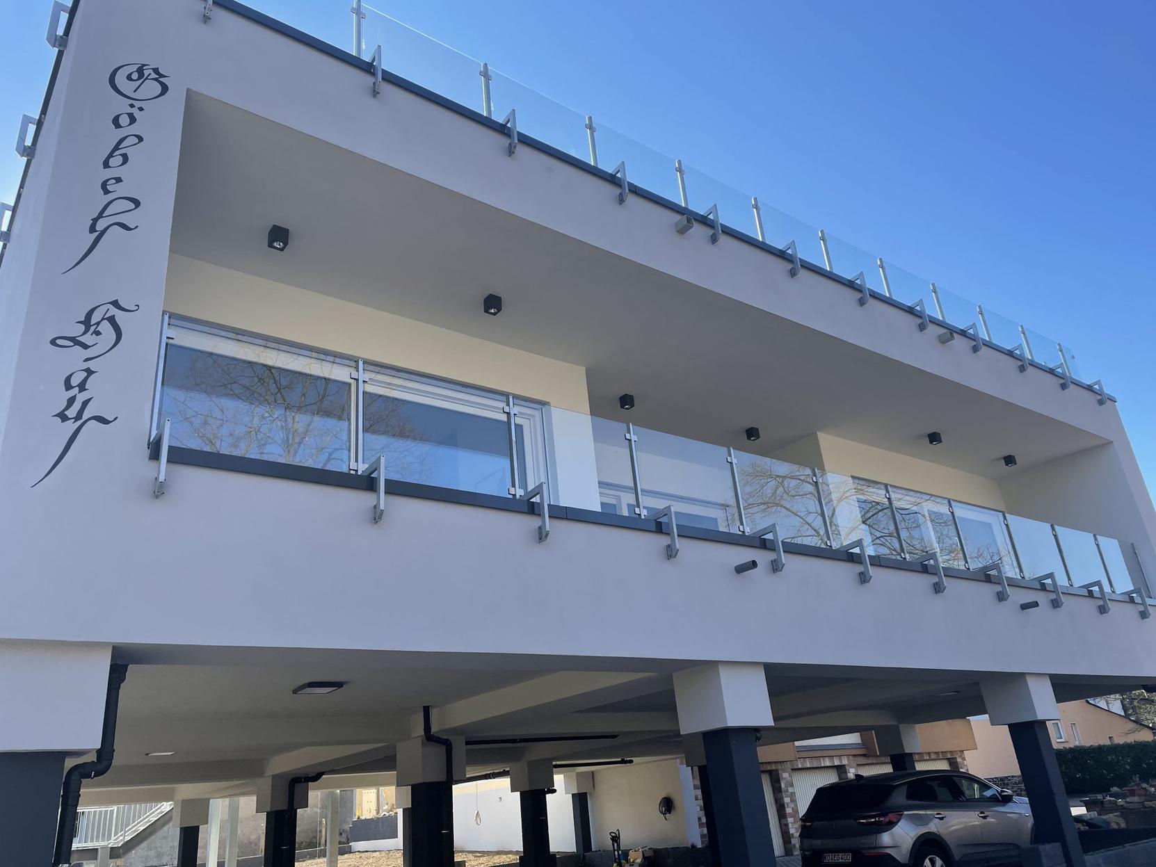 Auf dem 1. Obergeschoss befindet sich ein Staffelgeschoss in Holzrahmenbauweise mit einer großzügigen Dachterrasse, welche, ebenso wie der Balkon, mit einem schönen und modernen Glasgeländer abgesichert ist.